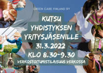 Tervetuloa Green Care Finland ry:n jäsenyritysten verkostoitumistilaisuuteen 31.3. klo 8.30-9.30, Teams. Tilaisuus on avoin kaikille Green Care Finland ry:n yritysjäsenille.
