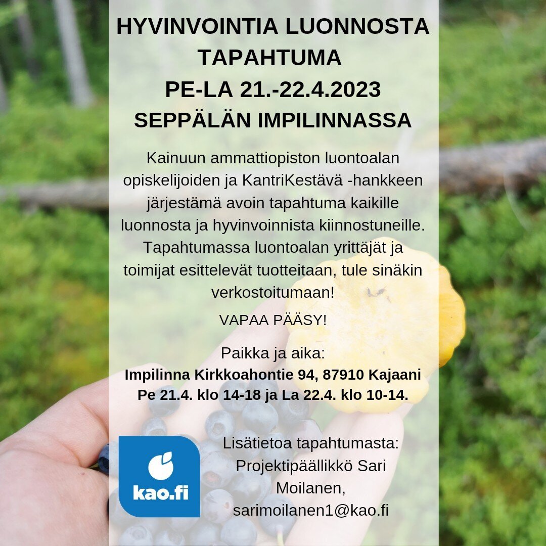 Kainuun ammattiopiston luontoalan opiskelijoiden ja KantriKestävä -hankkeen järjestämä Hyvinvointia luonnosta -tapahtuma on Seppälän Impilinnassa (Kirkkoahontie 94, 87910 Linnantaus, Kajaani) perjantaina 21.4.2023 klo 14–18 ja lauantaina 22.4.2023 klo 10.00–14.00.