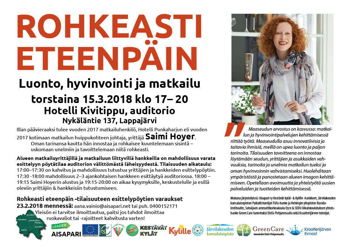 Maaseudun merkitys ja arvostus ovat kasvussa, mikä näkyy mm. siinä, että matkailun ja hyvinvointipalvelujen kehittämisessä riittää työtä. Maaseudulla asuu luovia, innovatiivisia ja taitavia ihmisiä, meillä on upea luonto ja maisemat ja kulttuurihistoriasta kumpuaa paljon tarinoita. Tilaisuuden tavoitteena on innostaa löytämään tämän seudun, yrittäjien ja asukkaiden vahvuuksia, tarinoita ja unelmia matkailun tueksi ja oman hyvinvoinnin vahvistamiseksi. Huolehditaan siitä, että luonto ja ympäristö voivat jatkossakin hyvin ja panostetaan alueen imagon kehittämiseen. Opetellaan avoimuutta ja yhteistyötä uusien palveluiden ja tuotteiden kehittämisessä.