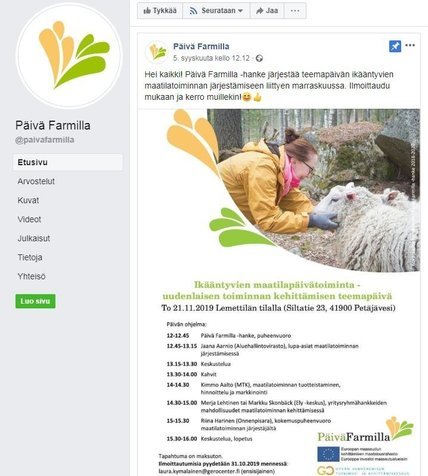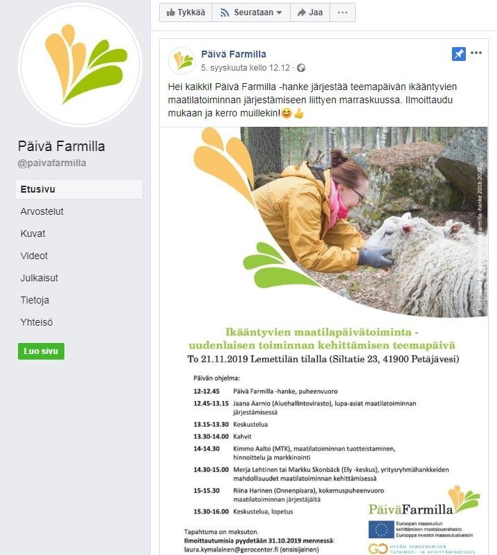 Päivä Farmilla -hanke järjestää teemapäivän liittyen ikääntyvien maatilatoiminnan järjestämiseen marraskuussa. Ilmoittaudu mukaan ja kerro muillekin! iLMOITTAUTUMINEN 31.10. MENNESSÄ laura.kymalainen@gerocenter.fi
