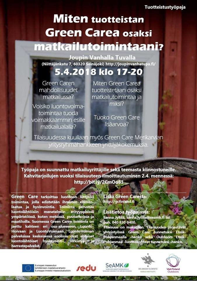 Tilaisuuden järjestävät yhteistyössä Green Care tunnetuksi Etelä-Pohjanmaalla -hanke sekä Outdoors Etelä-Pohjanmaa -luontokohteet tunnetuksi -hanke.