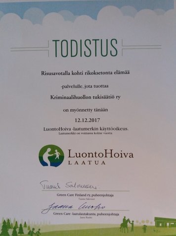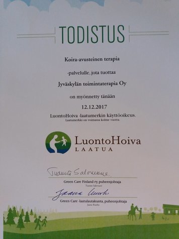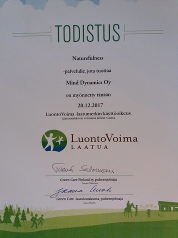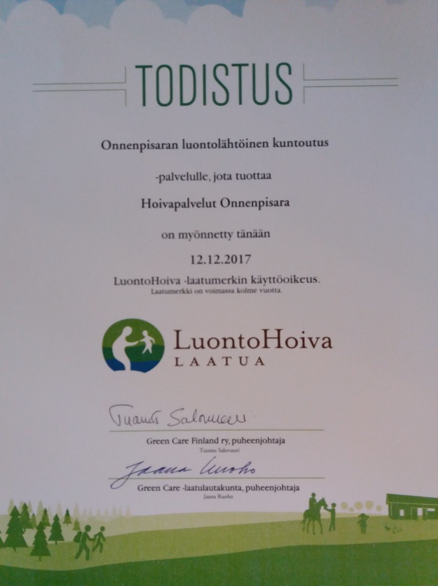 GC-laatulautakunta myönsi joulukuussa 2017 neljä laatumerkkiä. LuontoHoivan merkit saivat Jyväskylän toimintaterapia Oy:n koira-avusteinen terapia, Kriminaalihuollon tukisäätiön Risusavotalla kohti rikkeetöntä elämää -palvelu ja Onnenpisaran luontolähtöinen kuntoutus. LuontoVoiman merkin sai MindDynamicsin Naturefulness-palvelu.