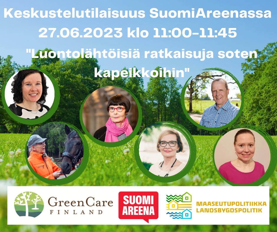 Maaseutupolitiikan neuvoston TUUMA- ja HYMY-verkostot, Green Care Finland ry sekä Maaseutupolitiikan neuvosto MANE järjestävät keskustelutilaisuuden tulevaisuuden sote-palveluista ja luontolähtöisten menetelmien tarjoamista ratkaisuista SuomiAreenassa tiistaina 27.6.2023 klo 11.00-11.45.