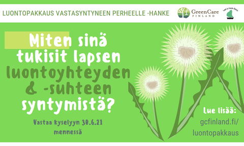Green Care Finland ry on saanut rahoituksen Luontopakkaus vastasyntyneen perheelle -hankkeen toteuttamiseen Lapsi ja Luonto Säätiöltä. Hankkeessa suunnitellaan ja testataan Luontopakkaus vastasyntyneen perheelle -paketti vuoden 2021 aikana. Paketin kohderyhmänä ovat erityisesti 0-6-vuotiaiden lasten perheet.