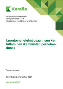 Sanna Kososen opinnäytetyön tarkoituksena oli tuottaa tietoa erilaisista luontomenetelmistä, joilla voidaan parantaa ikäihmisten hyvinvointia ja elämänlaatua. Opinnäytetyön tehtäviksi rajautuivat ikäihmisten perhehoidossa käytettyjen luontomenetelmien tunnistaminen, luontomenetelmien merkityksien arviointi yhdessä perhehoitajien kanssa ja luontomenetelmäoppaan kehittäminen.