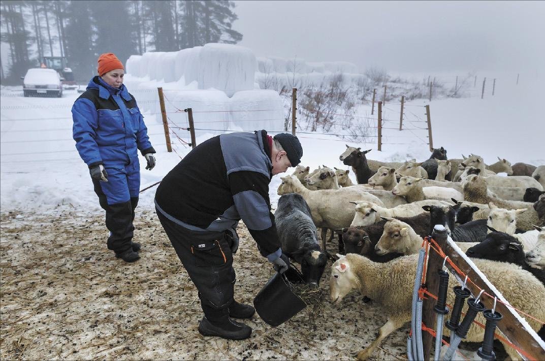 Tilalla kuntoudutaan, muttei terapoida. ”Asiakkaan ei tarvitse puhua omista asioistaan yhtään mitään, ellei halua. Jos haluaa, niin toki kuuntelemme”, kertoo Satu Kumpulainen. Lampaita ruokkimassa Eero Airas.