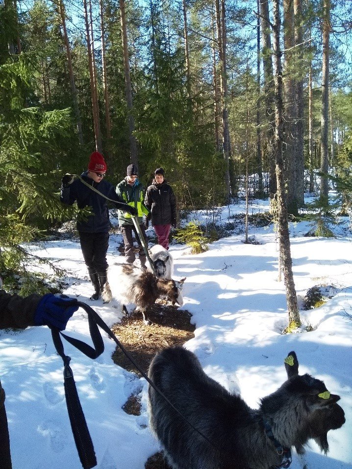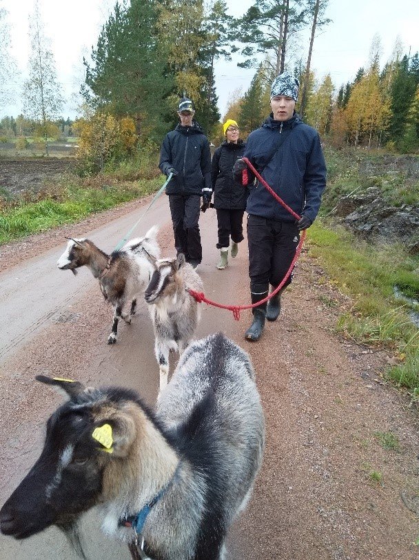 Toiminta ei ole rajattu vuodenaikojen mukaan vaan toimintaa voidaan toteuttaa ympäri vuoden. Tässä ryhmä lenkillä Lumikki-vuohen kanssa.