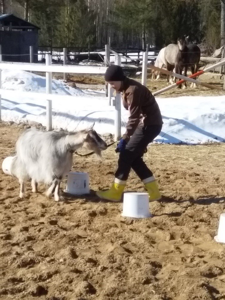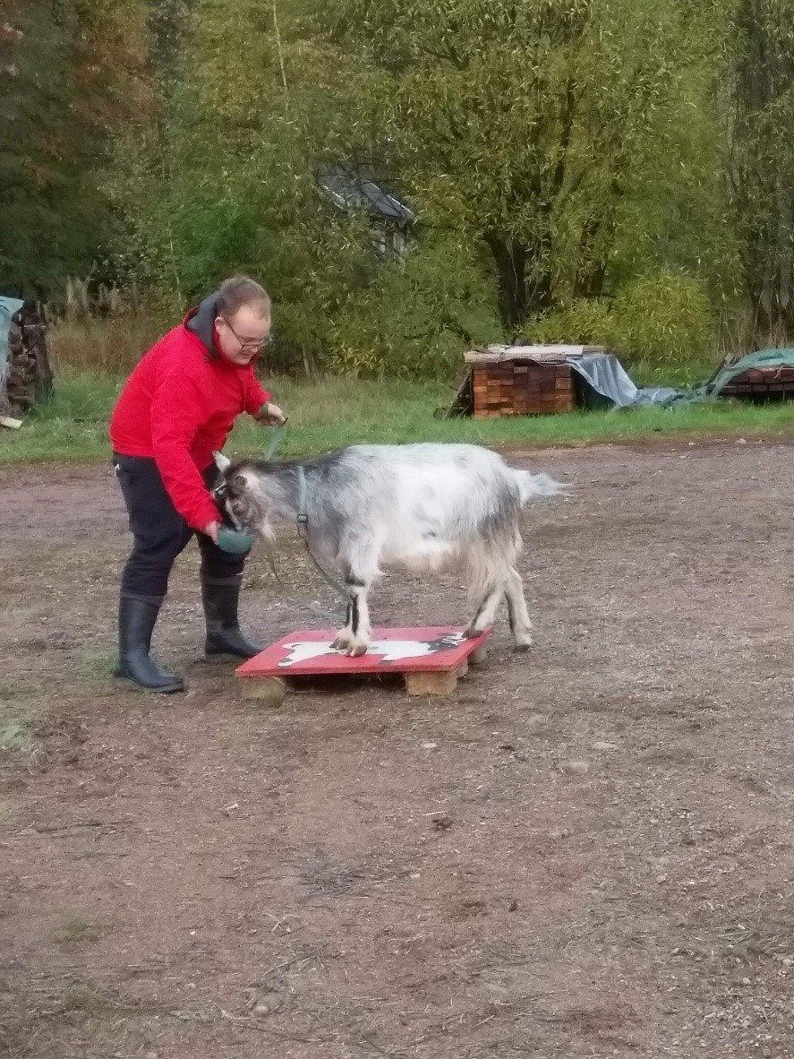 Asiakas radalla vuohen kanssa. Onnistuminen eläimen kanssa työskenneltäessä vahvistaa itsetuntoa ja itsepystyvyyttä. Lisäksi asiakas voi kokea saavansa vuohesta ystävän, kun hän hoitaa eläintä. Eläin ei arvota ihmistä tiettyyn lokeroon, vaan kohtelee kaikkia tasavertaisesti.