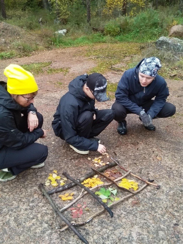Taukopaikalla eväiden syönnin jälkeen tehdään metsäluontoa käyttäen keskittymistä vaativa harjoitus keräämällä eri värisiä maahan tippuneita lehtiä kepeistä tehtyihin lokeroihin. Lopuksi katsotaan, mitkä lehdet maistuvat vuohille parhaiten. |