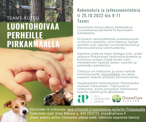 Luontohoivaa perheille Pirkanmaalla - tukiprosesseja haasteellisiin elämäntilanteisiin eläin-, maatila-, luontoja puutarha-avusteisesti -hanke pilotoi Green Care Pirkanmaan aluejaoston ja kuntien yhteistyönä Luontohoiva-tukiprosessia perheille, joilla on taloudellisia ja psykososiaalisia kuormitustekijöitä. Hanke kohdentuu pirkanmaalaisiin perheisiin, joilla elämäntilannetta kuormittavat esim. mielenterveysongelmat, murrosikäisen koulunkäynnin pulmat tai neurokirjon haasteet.
