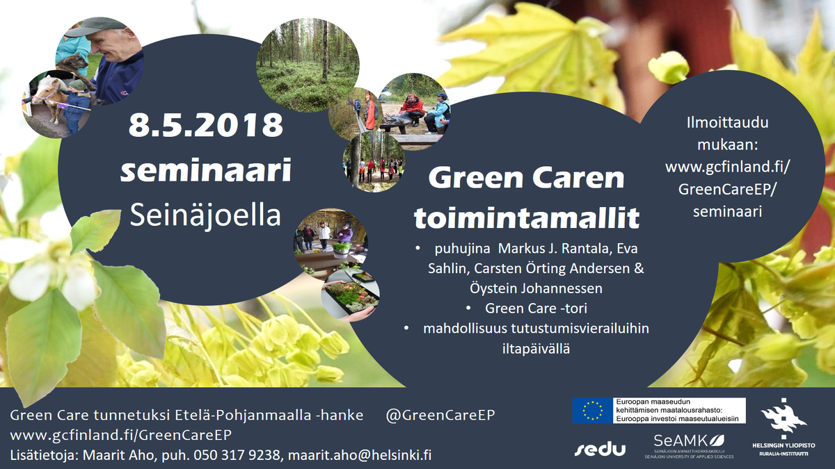 Seinäjoella 8.5. järjestettävään seminaariin on tulossa scandinaavisia huippuvieraita! Päivän teemana erityisesti Green Caren toimintamallit. Tule paikalle kuuntelemaan, millä eri tavoilla luonto-, eläin-, maatila- ja puutarha-avusteisuutta voisi hyödyntää hyvinvoinnin edistämisessä! Lisätietoa tapahtuman verkkosivulla!