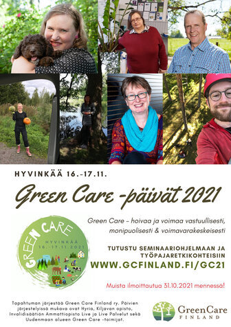 - Päivien avaus ja katsaus kentän ajankohtaisiin aiheisiin, Green Care Finland ry sekä useampi puheenvuoro, mm. Martta Ylilauri, Vaasan yliopisto, InnoLab, esittelee Green Care -toiminnan taloudellista arviointia SROI-menetelmällä, casena Soiten Green Care -työtoiminta kehitysvammaisille asiakkaille.