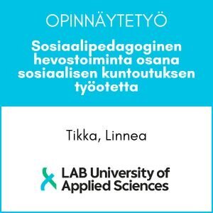 Opinnäytetyössä kuvattiin sosiaalipedagogista hevostoimintaa sekä sen käyttöä osana sosiaalista kuntoutusta. Tarkoituksena oli koota jo tutkittua tietoa sosiaalipedagogisen hevostoiminnan vaikutuksista, jotta sitä voitaisiin hyödyntää sosiaalialan työkentällä tulevaisuudessa enemmänkin. Lue lisää
