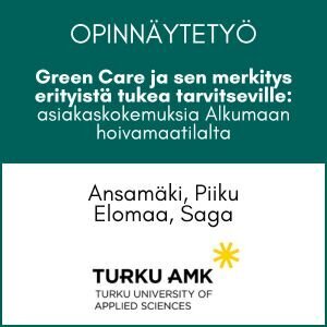Kehittämistyön tehtävänä oli tuoda näkyväksi Green Care -menetelmien merkitys erityistä tukea tarvitseville lapsille ja nuorille. Merkitys perusteltiin Alkumaa Oy:n sosiaalipalveluiden asiakkaiden ja heidän omaistensa kokemuksilla sekä heidän kokemuksiaan vahvistavalla teoreettisella viitekehyksellä. Lue lisää
